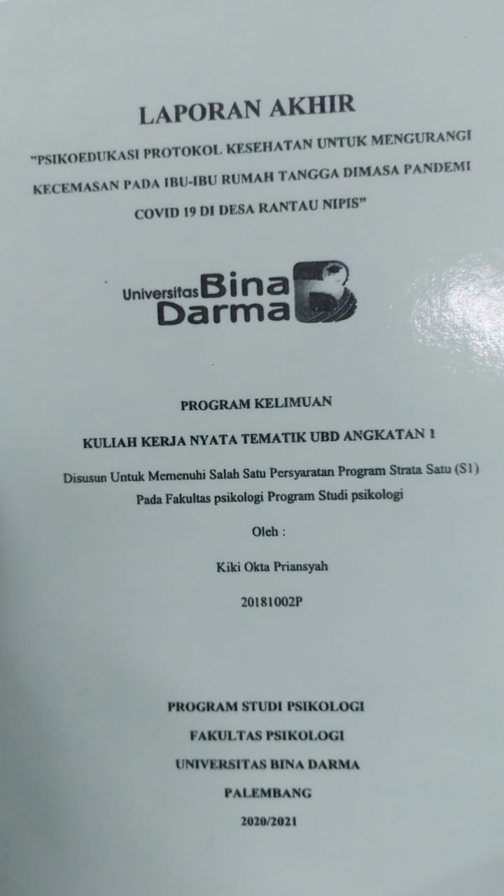 | Judul | PSIKOEDUKASI PROTOKOL KESEHATAN UNTUK MENGURANGI KECEMASAN PADA IBU-IBU RUMAH TANGGA DIMASA PANDEMI COVID 19 DI DESA RANTAU NIPIS / KIKI OKTA PRIANSYAH |