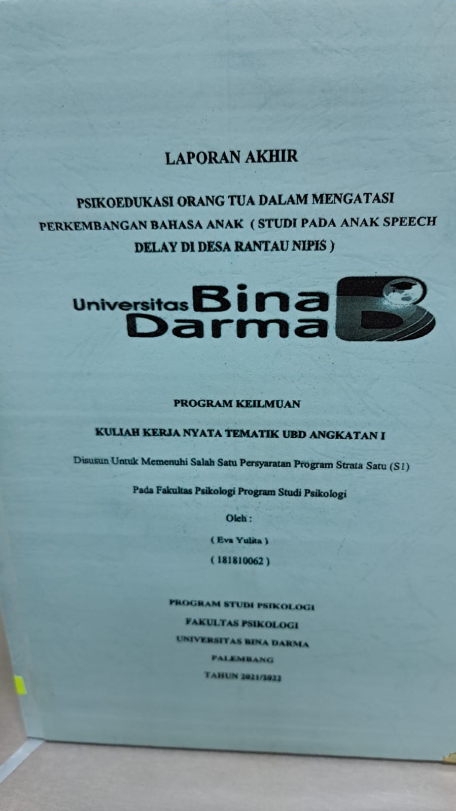 | Judul | PSIKOEDUKASI ORANG TUA DALAM MENGATASI PERKEMBANGAN BAHASA ANAK (STUDI PADA ANAK SPEECH DELAY DI DESA RANTAU NIPIS) / EVA YULITA |