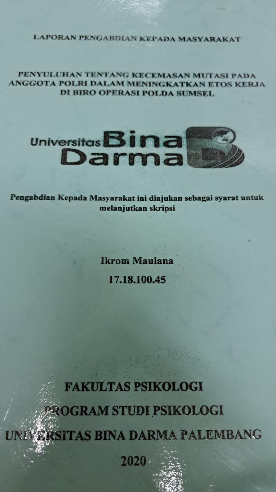 | Judul | PENYULUHAN TENTANG KECEMASAN MUTASI PADA ANGGOTA POLRI DALAM MENINGKATKAN ETOS KERJA DI BIRO OPERASI POLDA SUMSEL / IKROM MAULANA |