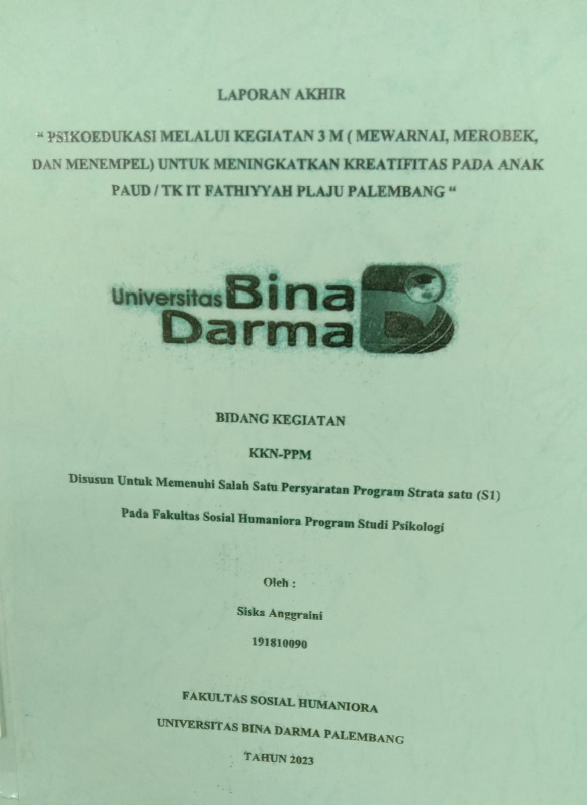 | Judul | PSIKOEDUKASI MELALUI KEGIATAN 3M (MEWARNAI, MEROBEK, DAN MENEMPEL) UNTUK MENINGKATKAN KREATIFITAS PADA ANAK PAUD/ TK IT FATHIYYAH PLAJU PALEMBANG / SISKA ANGGRAINI |