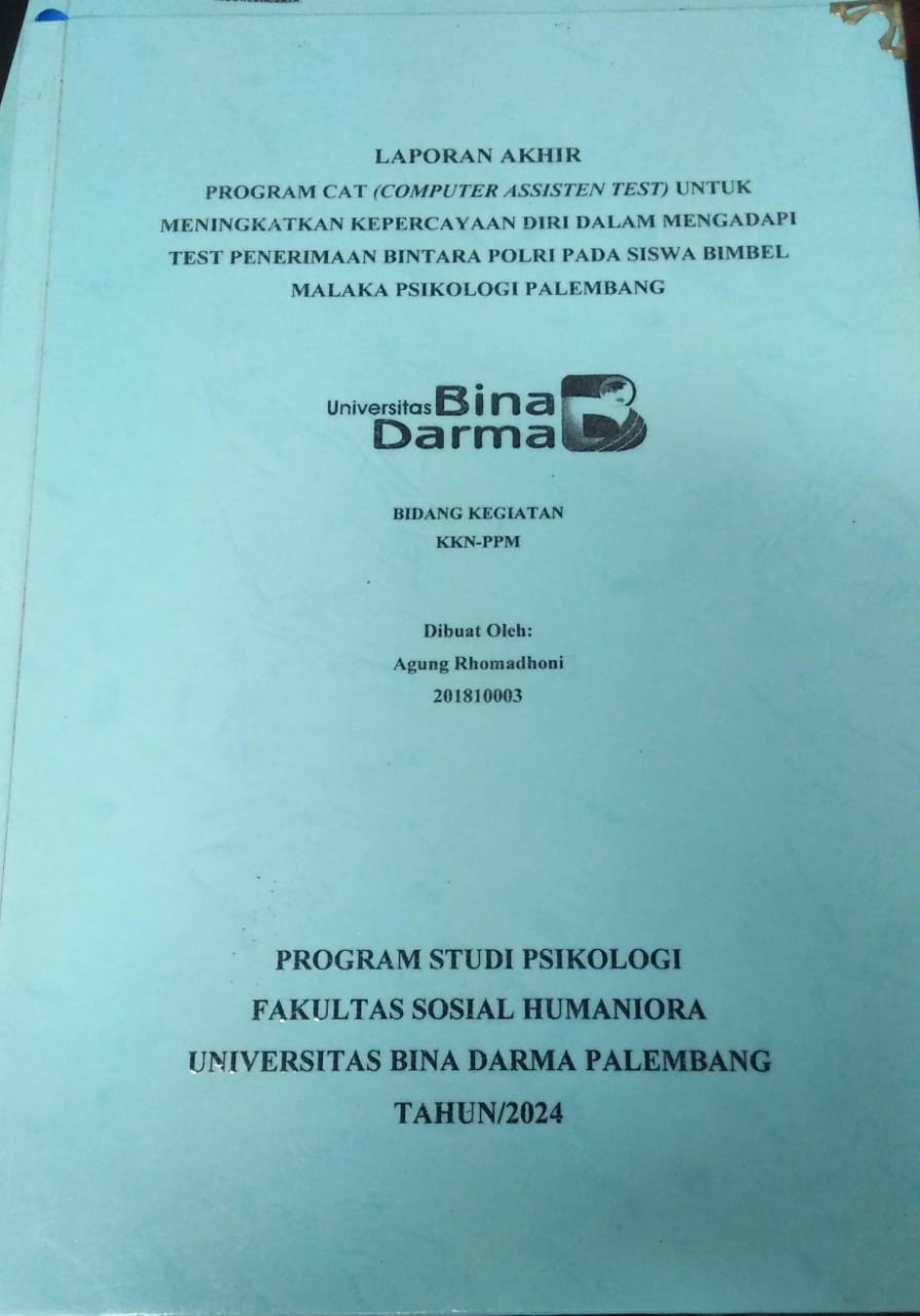 Judul | PROGRAM CAT (COMPUTER ASSISTEN TEST) UNTUK MENINGKATKAN KEPERCAYAAN DIRI DALAM MENGHADAPI TEST PENERIMAAN BINTARA POLRI PADA SISWA BIMBEL MALAKA PSIKOLOGI PALEMBANG / Agung Rhomadhoni |