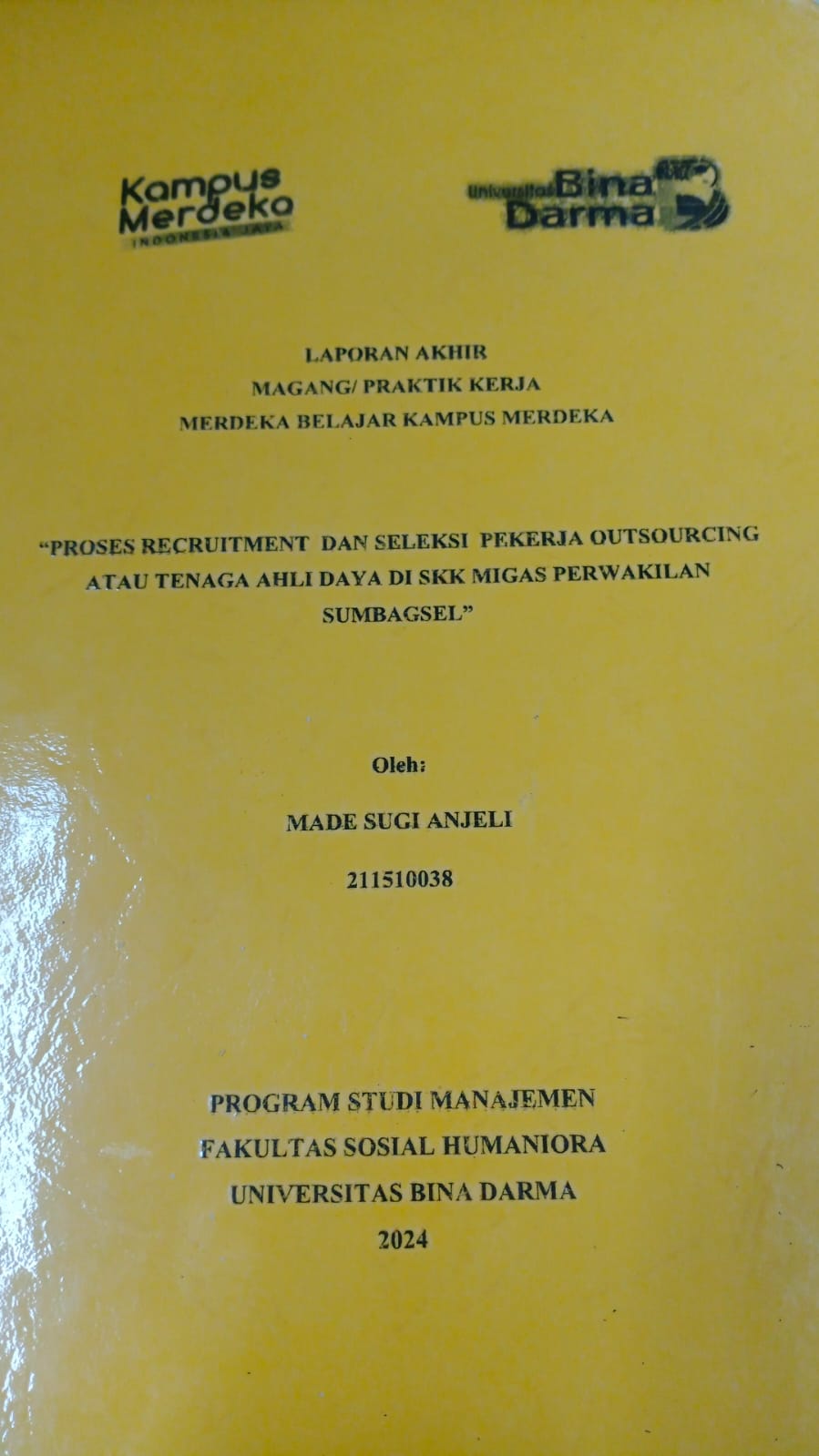 | Judul | PROSES RECRUITMENT DAN SELEKSI PEKERJA OUTSOURCING ATAU TENAGA AHLI DAYA DI SKK MIGAS PERWAKILAN SUMBAGSEL / Made Sugi Anjeli (211510038) |