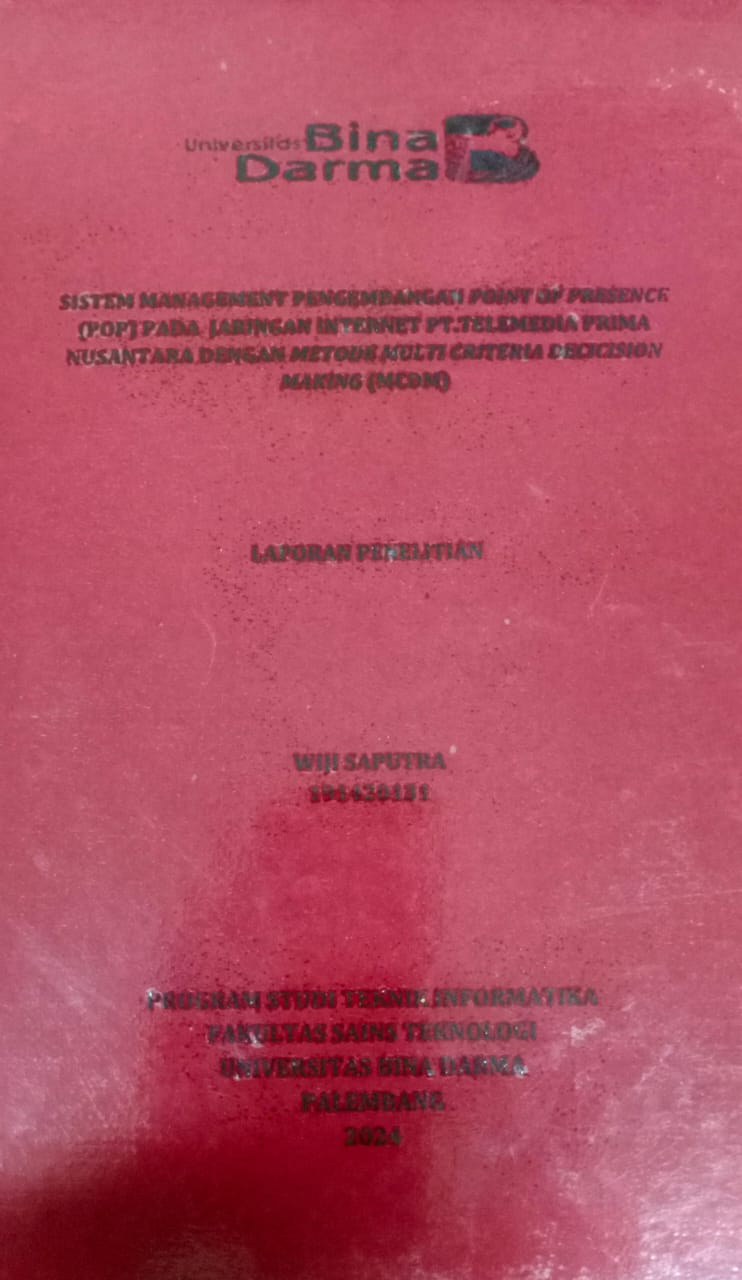 | Judul | SISTEM MANAGEMENT PENGEMBANGAN POINT OF PRESENCE )POP) PADA JARINGAN INTERNET PT.TELEMEDIA PRIMA NUSANTARA DENGAN METODE MULTI CRITERIA DECISION MAKING (MCDM) / Wiji Saputra (191420131) |