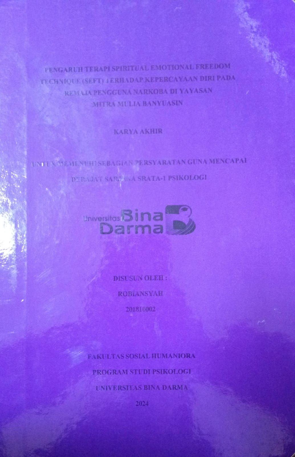 | Judul | PENGARUH TERAPI SPIRITUAL EMOSIONAL FREEDOM TECHNIQUE (SEFT) TERHADAP KEPERCAYAAN DIRI PADA REMAJA PENGGUNA NARKOBA DI YAYASAN MITRA MULIA BANYUASIN / Robiansyah |