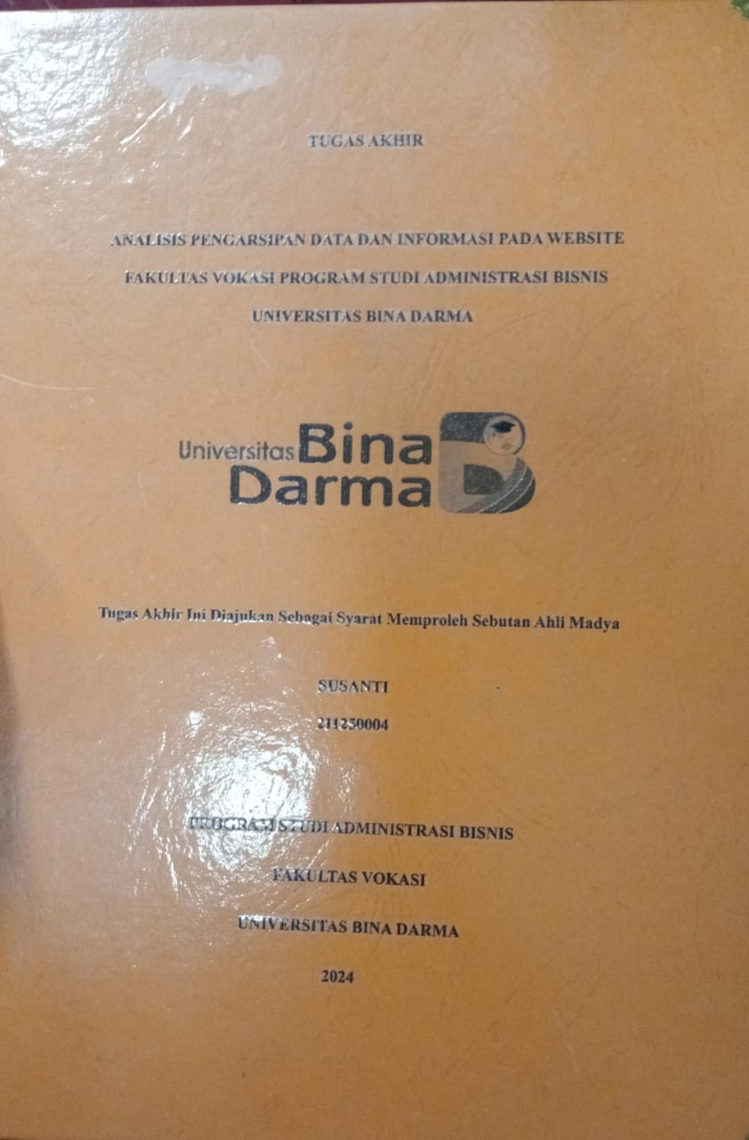 | Judul | ANALISIS PENGARSIPAN DATA DAN INFORMASI PADA WEBSITE FAKULTAS VOKASI PROGRAM STUDI ADMINISTRASI BISNIS UNIVERSITAS BINA DARMA / Susanti |
