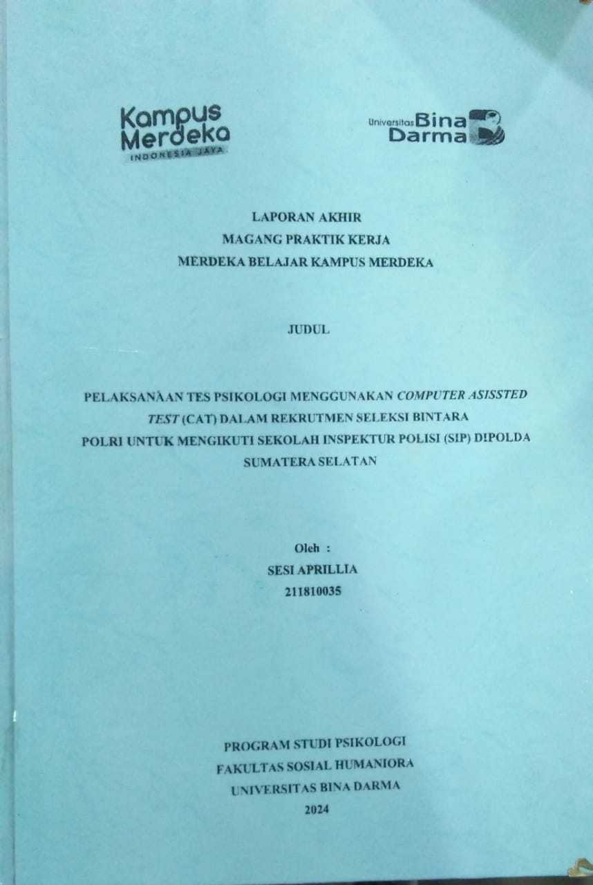| Judul | PELAKSANAAN TES PSIKOLOGI MENGGUNAKAN COMPUTER ASISSTED TEST (CAT) DALAM REKRUTMEN SELEKSI BINTARA POLRI UNTUK MENGIKUTI SEKOLAH INSPEKTUR POLISI (SIP) DIPOLDA SUMATERA SELATAN / Sesi Aprillia |