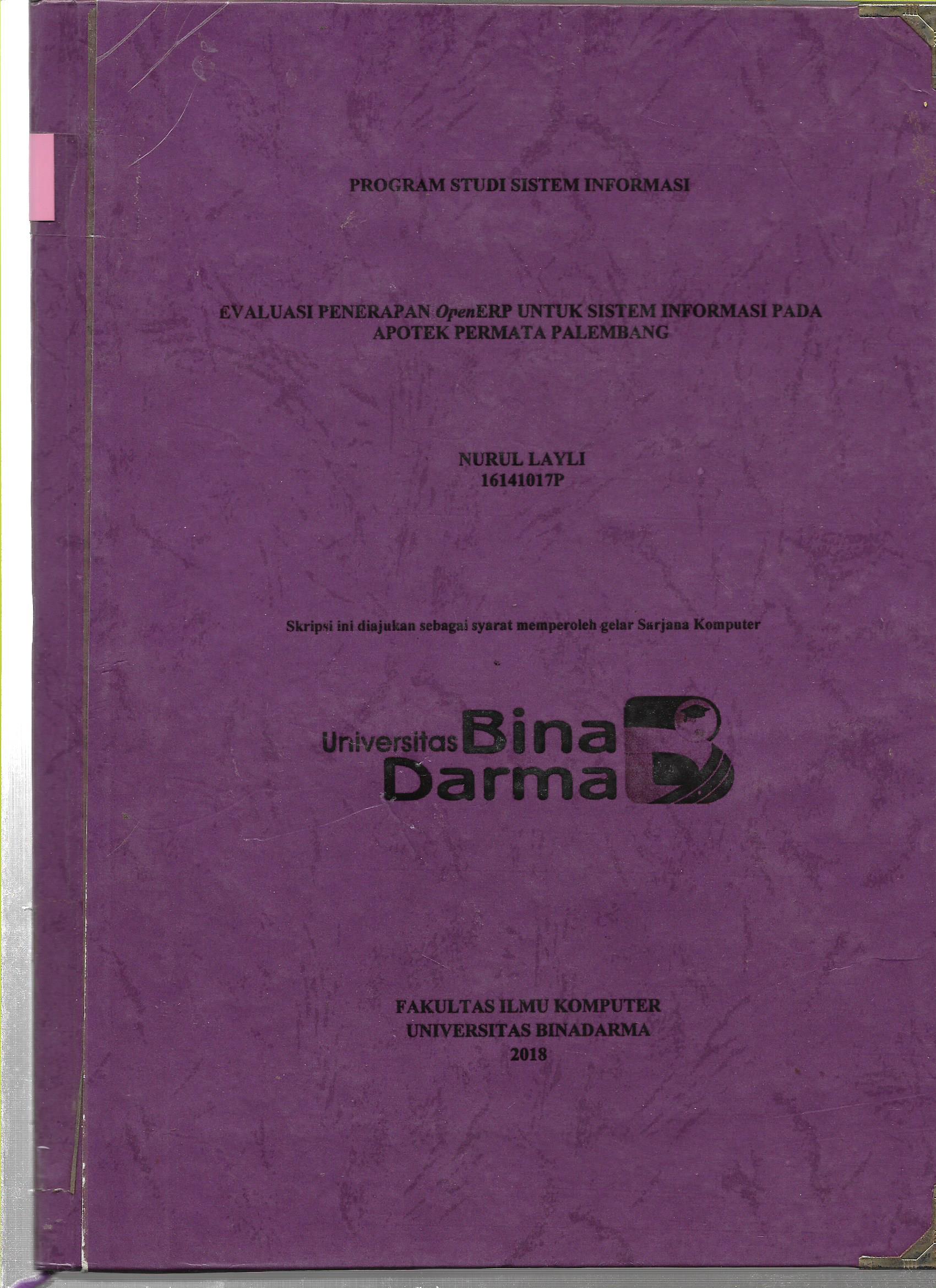 Judul | EVALUASI PENERAPAN OPENERP UNTUK SISTEM INFORMASI PADA APOTEK PERMATA PALEMBANG / Nurul Layli |